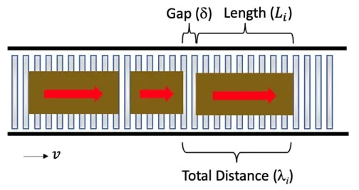 下图展示了传统MDR输送线的示意图,说明了这一挑战。滚筒中心之间的总距离(λ)由每个区域中的从动滚筒数量决定。由于区域尺寸由最大包裹设定,如果输送线处理不同尺寸的混合纸箱,每个物品间的间隙(δ)将会有很大差异,导致大量空间浪费。